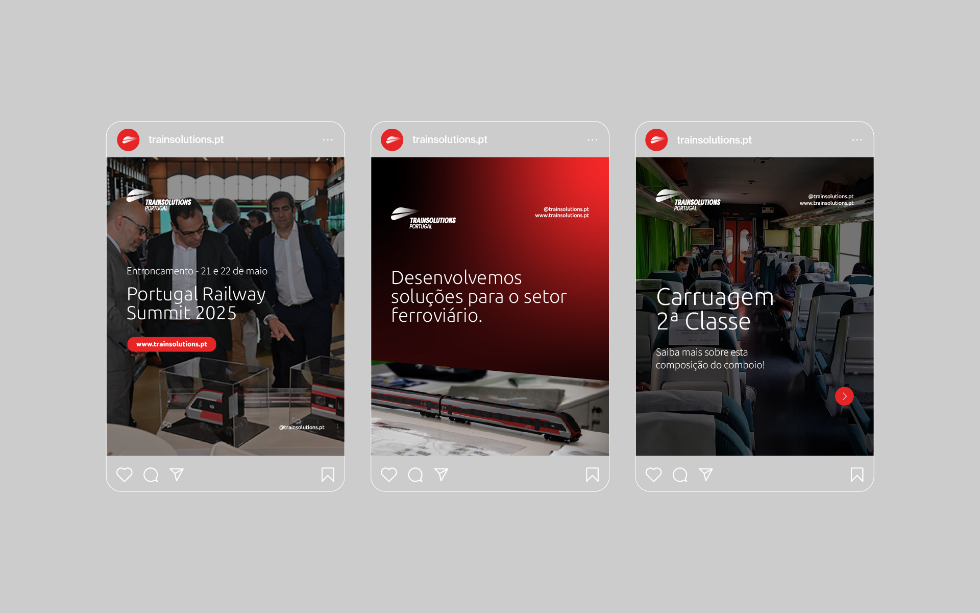 (bannières, roll-ups, supports physiques) aux contenus digitaux et institutionnels. La cohérence visuelle entre tous les matériaux renforce le professionnalisme, le sérieux et l’impact de la marque TrainSolutions Portugal.